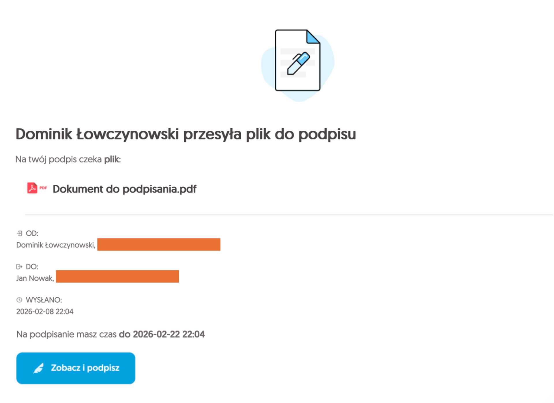 - Gdy otrzymasz dokument do podpisu na platformie CertumSign, otwórz wiadomość i sprawdź informacje o pliku. Aby wyświetlić i podpisać dokument, kliknij Zobacz i podpisz