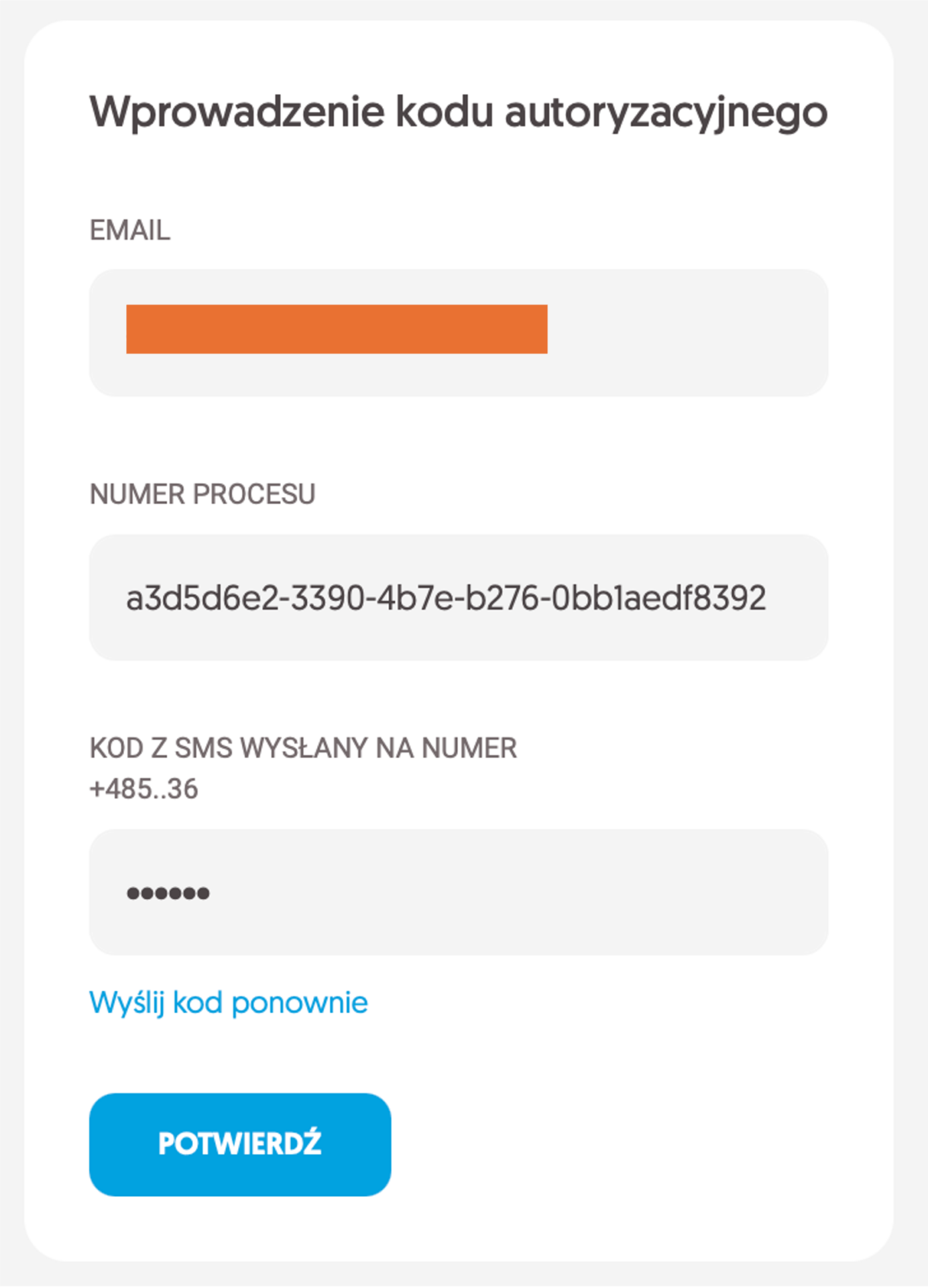 - Kod z SMS wpisz w polu KOD AUTORYZACYJNY i kliknij POTWIERDŹ