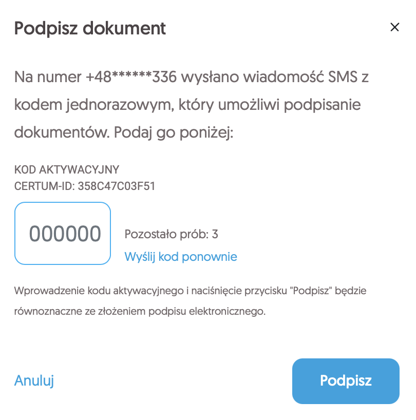 - Na przypisany do konta numer telefonu otrzymasz SMS z kodem do złożenia podpisu