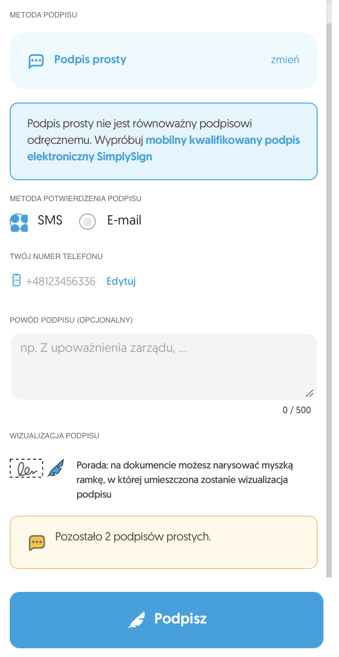 Podpisanie pliku PDF podpisem prostym (autoryzacja kodem SMS lub e-mail)